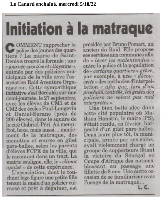 En septembre 2022, les parents de l’élémentaire Langevin de Saint-Denis apprennent effarés que leurs enfants ont été initiés à des techniques particulièrement violentes sur le temps de l’école. Sur une initiative des élus, au nom de la prévention, nos enfants, du CP au CM2, se sont entraînés au tir, ont appris les techniques du placage ventral et du maniement du « bâton de défense » (tonfa), se sont menottés entre eux… Lire en 4 volets le décryptage de Prox’aventure sur le Blog de Saint-Denis: Prox’aventure, la citoyenneté à coups de matraques.