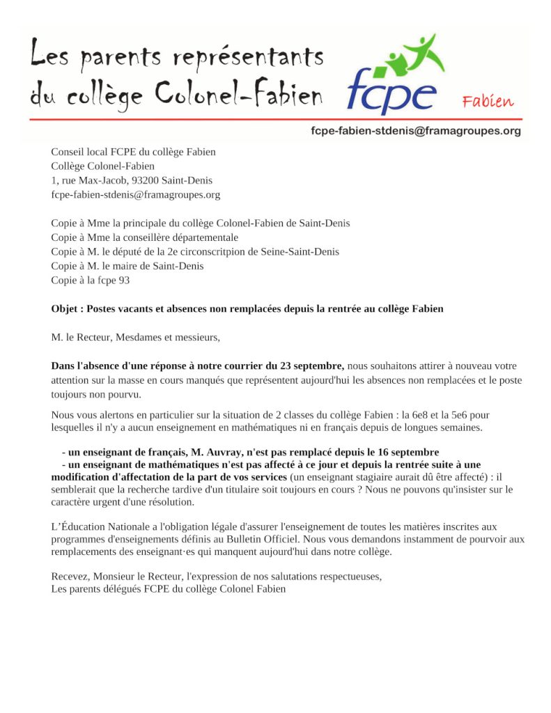 Nous vous alertons en particulier sur la situation de 2 classes du collège Fabien : la 6e8 et la 5e6 pour lesquelles il n'y a aucun enseignement en mathématiques ni en français depuis de longues semaines. - un enseignant de français, M. Auvray, n'est pas remplacé depuis le 16 septembre - un enseignant de mathématiques n'est pas affecté à ce jour et depuis la rentrée suite à une modification d'affectation de la part de vos services (un enseignant stagiaire aurait dû être affecté) : il semblerait que la recherche tardive d'un titulaire soit toujours en cours ? Nous ne pouvons qu'insister sur le caractère urgent d'une résolution. L’Éducation Nationale a l'obligation légale d'assurer l'enseignement de toutes les matières inscrites aux programmes d'enseignements définis au Bulletin Officiel. Nous vous demandons instamment de pourvoir aux remplacements des enseignant·es qui manquent aujourd'hui dans notre collège. Recevez, Monsieur le Recteur, l'expression de nos salutations respectueuses, Les parents délégués FCPE du collège Colonel Fabien
